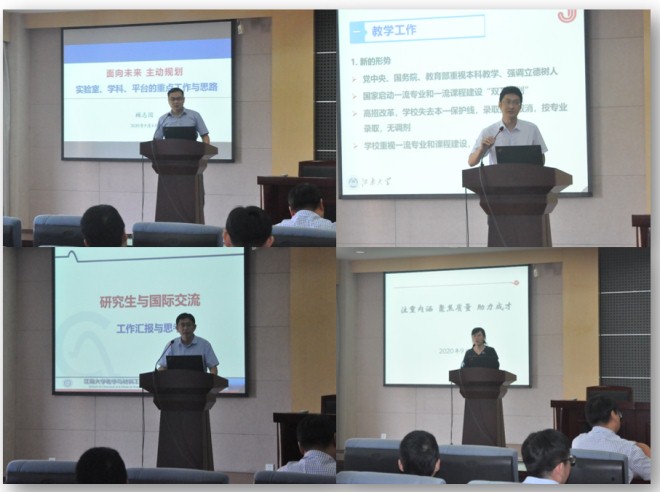 的四大重点工作,即全国第五轮学科评估迎评工作、材料科学与工程一级博士点申报工作、合成与生物胶体教育部重点实验室和光响应功能分子材料国际联合研究中心的建设工作,希望全体教职工在新的形势下,认真完成新的任务,做出新的作为!