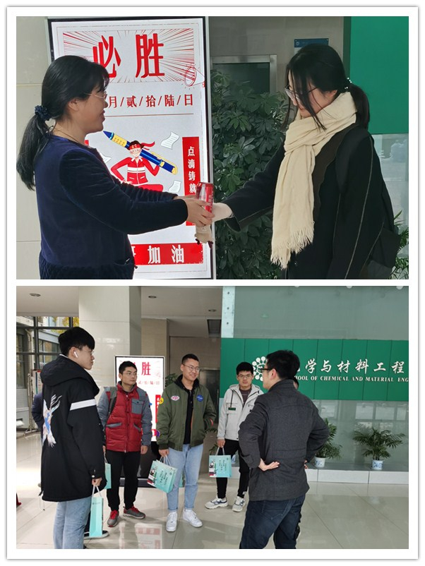 在化工楼一楼大厅举办考研慰问活动,为考研学子鼓劲加油,党委副书记田卫平、大四年级班主任、辅导员参与了此次活动。
