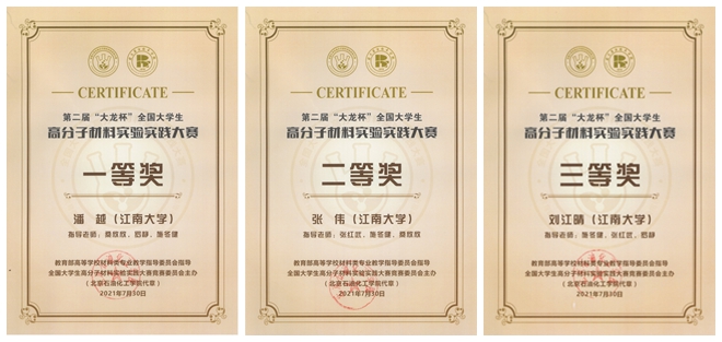 罗静、施冬健、桑欣欣和张红武四位老师指导的高分子材料专业三名参赛选手全部获奖——潘越、张伟和刘江晴分别荣获一等奖(最高奖)、二等奖和三等奖的好成绩。